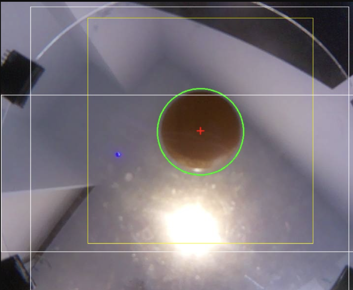 Now we have all the important bits of post-processing done, we just calculate the velocity based on old data, and package it into a nice list, and we send it off to our ball balancer to deal with. We also do some fancy annotations onto our frame, with the RoIs, and a circle highlighting the detected ball, and a marker for its centre.